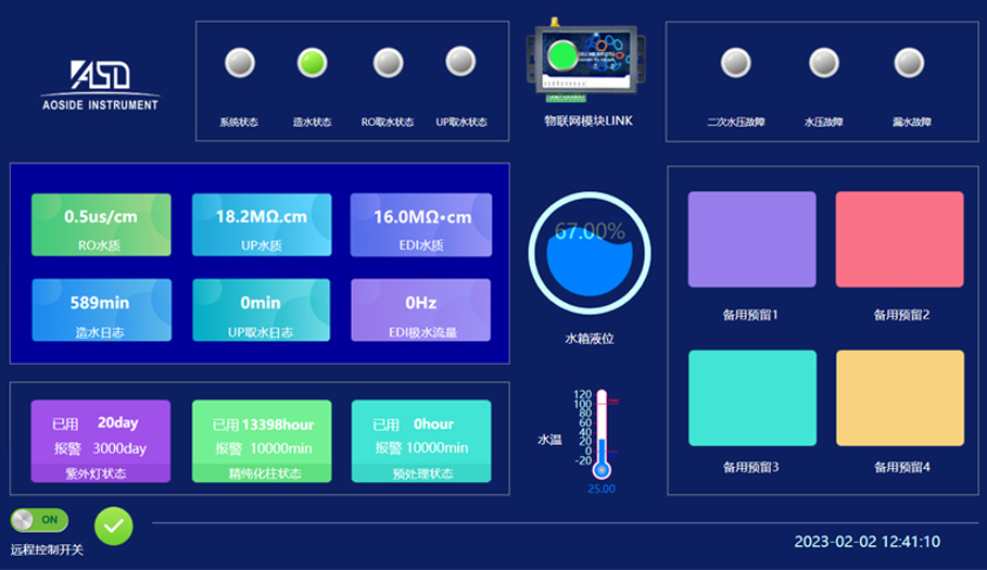 7寸彩色电容触摸屏,触摸屏界面可同时显示FEED源水(进水)、RO纯水(三级水)EDI纯水(二级水)、UP超纯水(一级水)四种水质参数及其水温,并显示反渗透膜DR(脱盐率)参数。 可设置EDI纯水、UP超纯水产水不合格报警(用户可任意设置报警值),文字、色块双重提醒