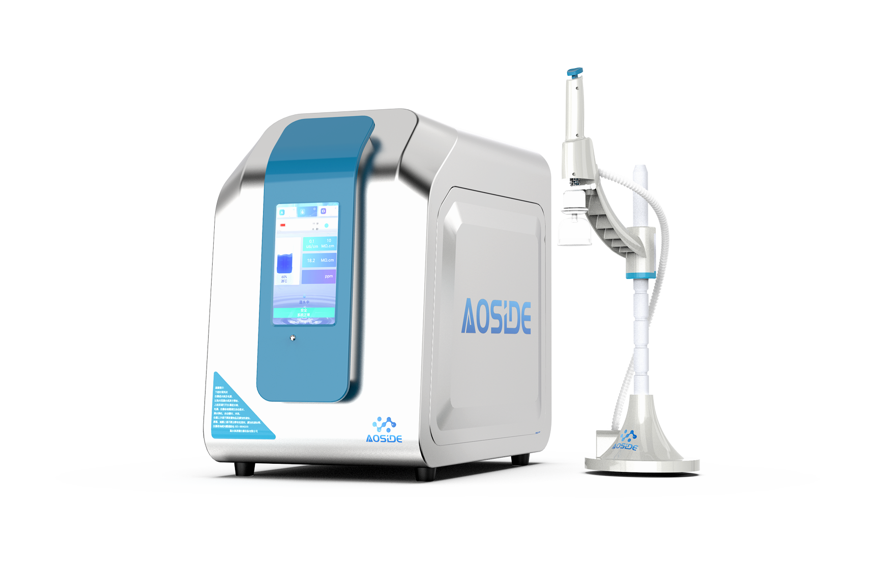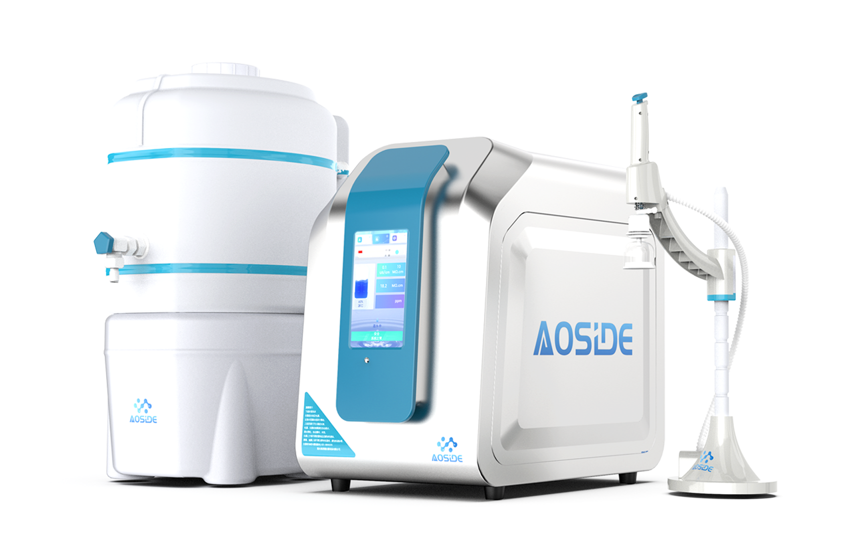 超纯水自带取水手臂,2.5米半径任意放置(可配脚踏开关解放双手取水,可选配奥思德第三代取水手臂:具备定时、定量、定速(0-2L/min,18档可调)取水功能,5寸触屏操作可显示取水水质、水温)